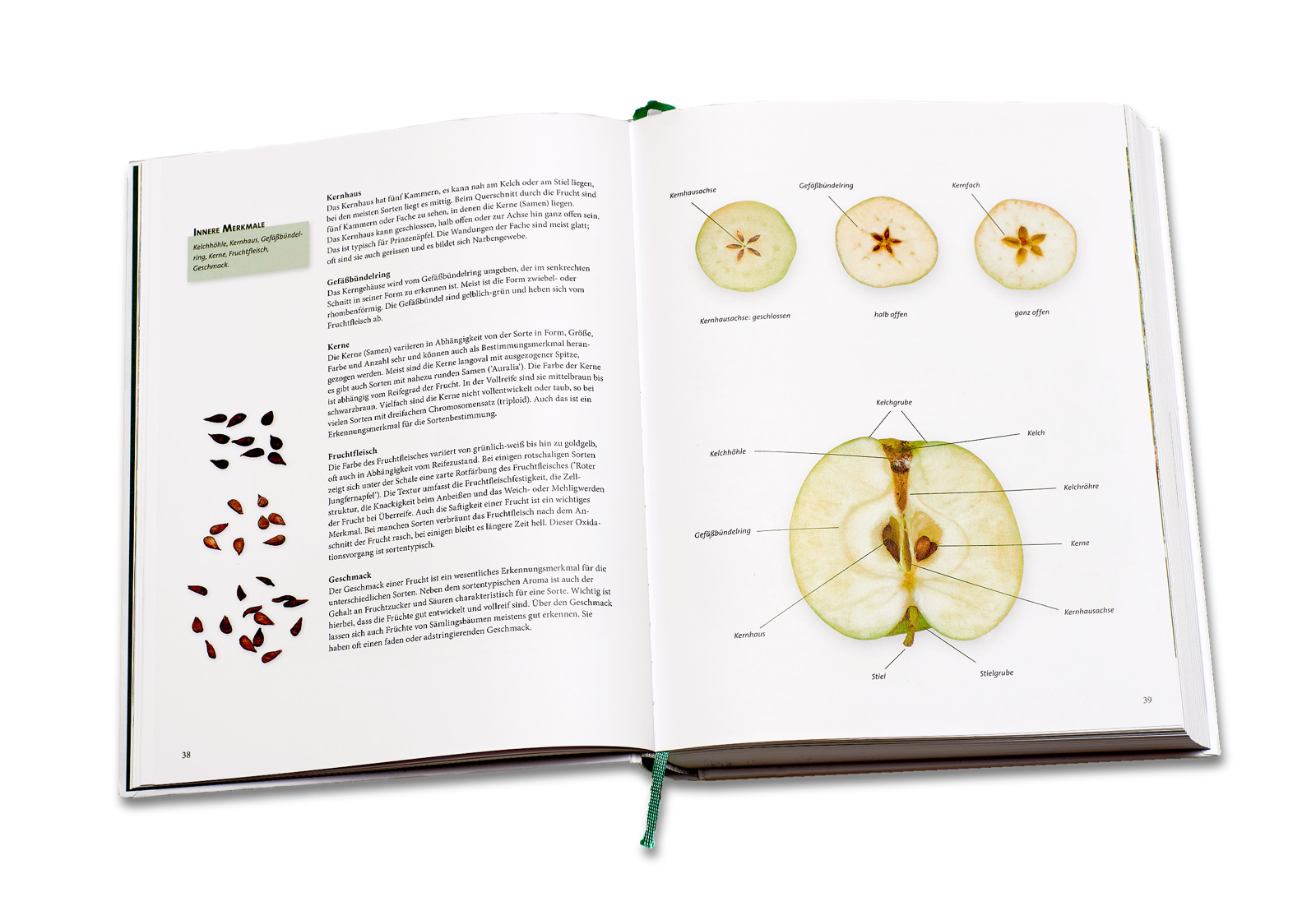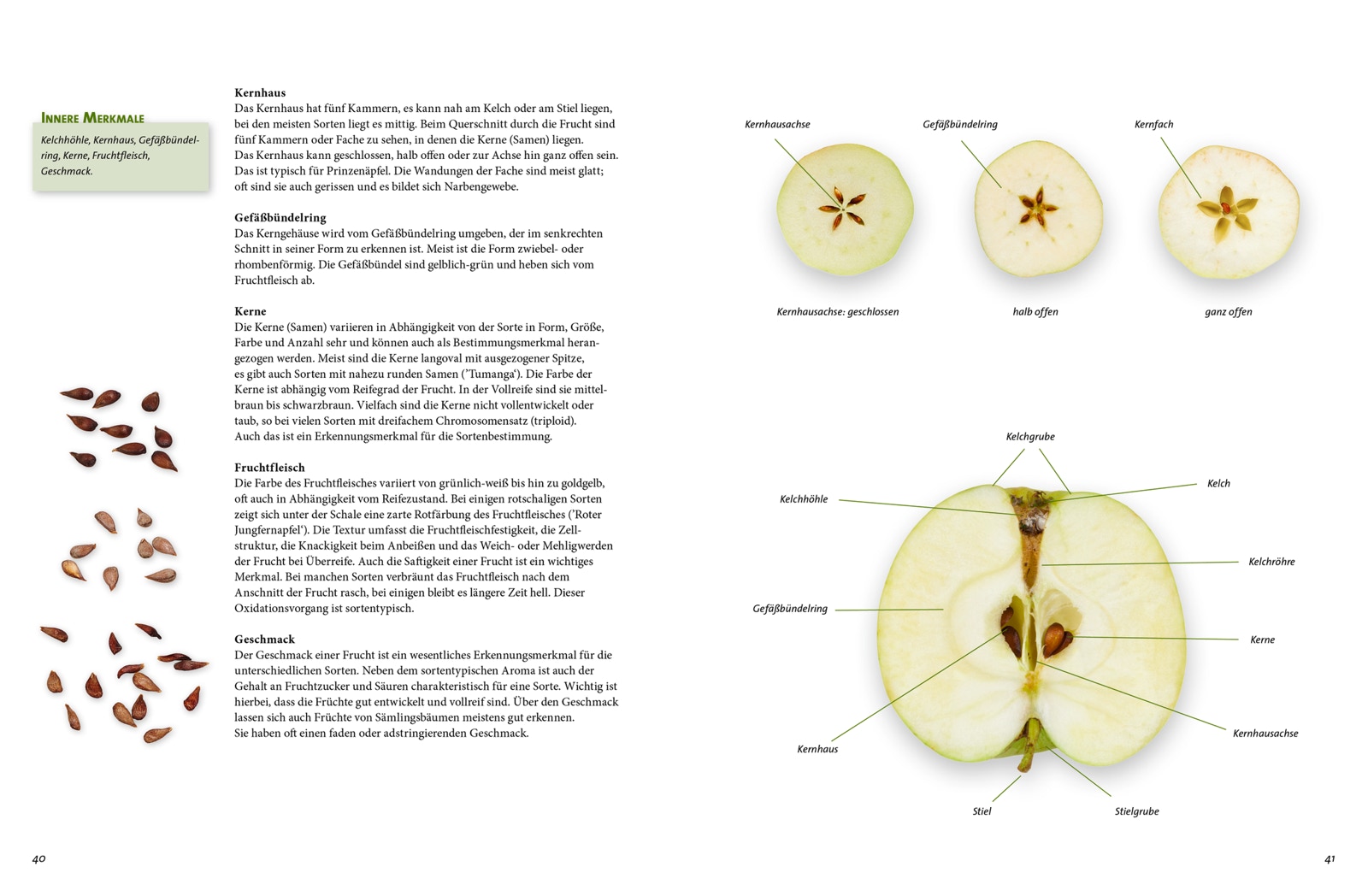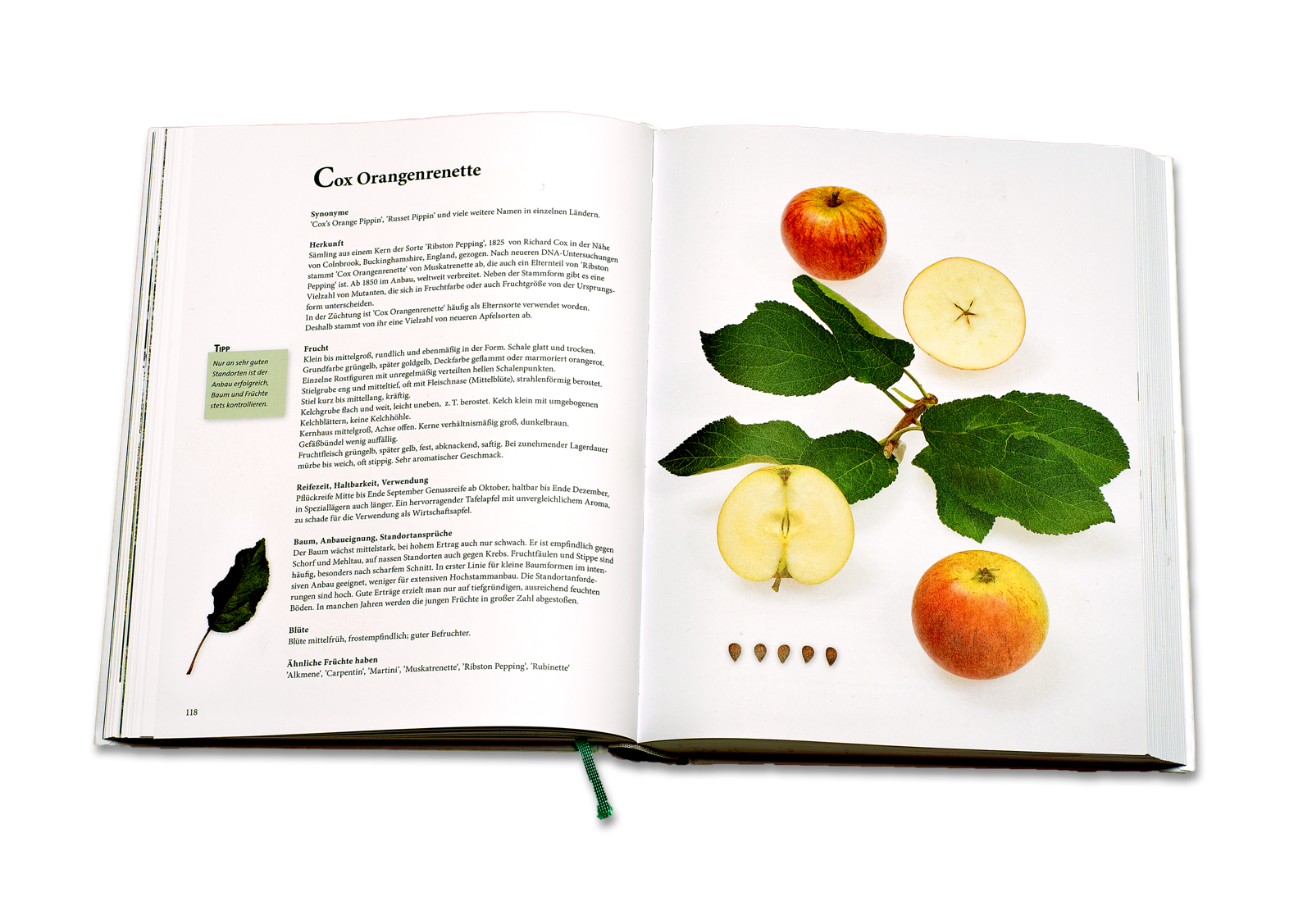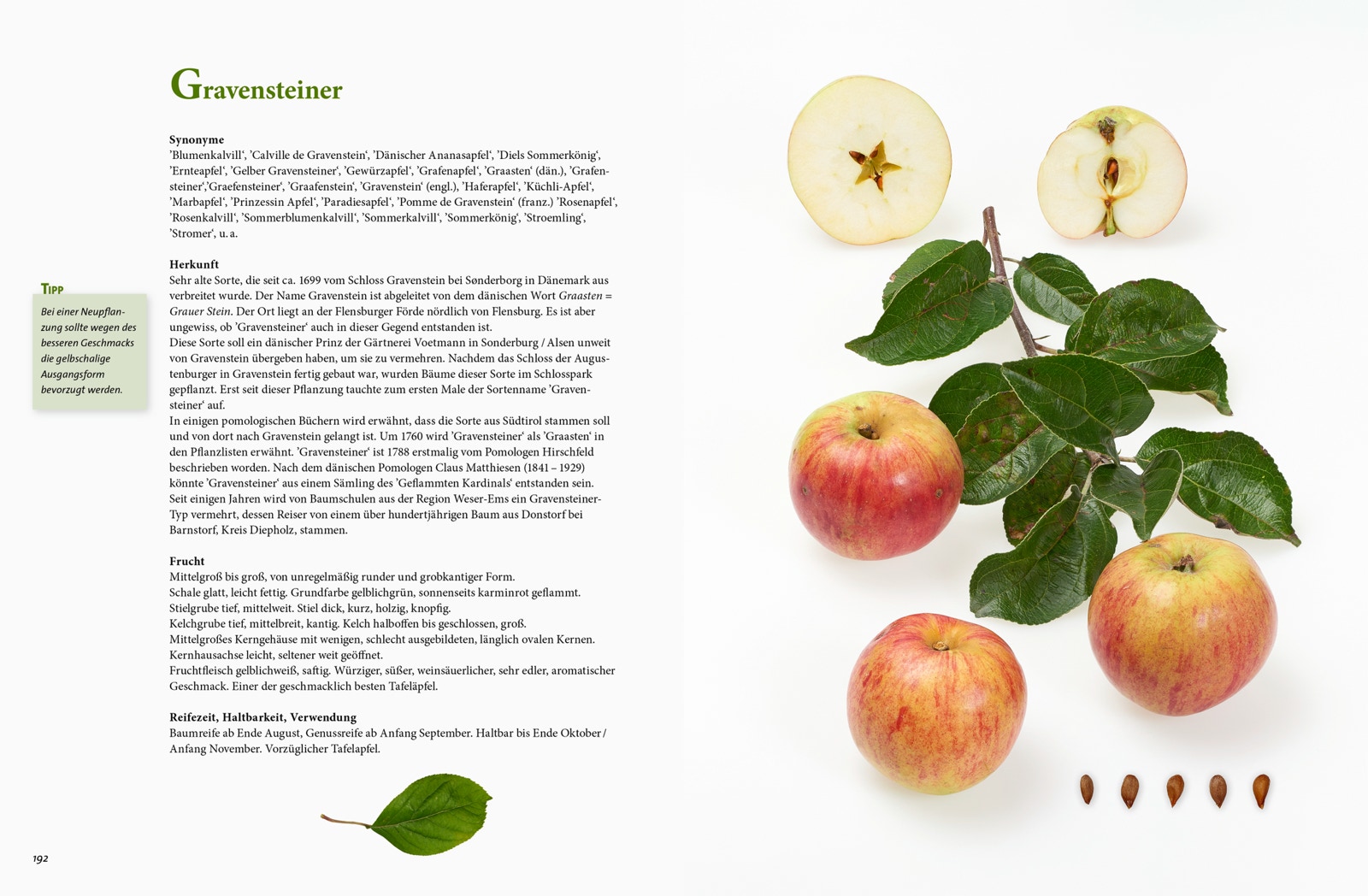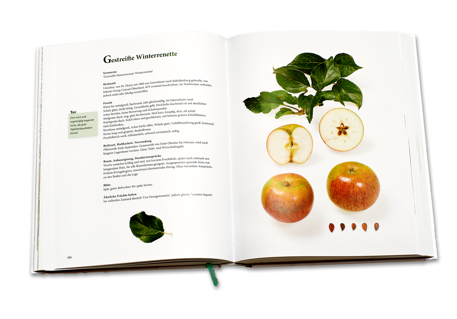 Dieses Apfelsortenbuch geht in der Darstellung der Sorten neue Wege. Im Studio erstellte, ganzseitige Fotografien zeigen jeweils mehrere Früchte einer Sorte in verschiedenen Ansichten, sowie Längs- und Querschnitte und die zugehörigen Apfelkerne. Auf diesen Bildern sind die sortentypischen Kelch- und Stielpartien zu sehen, die für eine Sortenbestimmung wichtig sind. Eine ausführliche Beschreibung der Frucht- und Baummerkmale ergänzt die bildliche Darstellung. In dieser Form werden insgesamt 174 alte und neuere Sortenvorgestellt, die in Deutschland und in den Nachbarländern zu finden sind. Apfelallergiker finden Hinweise auf für sie verträgliche oder weniger verträgliche Sorten. Aktuelle DNA-Untersuchungen ermöglichen, viele, bislang unbekannte Abstammungsverhältnisse von einzelnen Sorten zu ermitteln, die im Buch aufgeführt werden. Mit tabellarischen Angaben zur Blüte- und Reifezeit, der Beschreibung der Standortansprüche sowie der Anfälligkeit gegenüber Krankheiten werden wichtige Entscheidungshilfen bei der Auswahl von passenden Sorten für Hausgarten oder Obstwiesen in der Landschaft gegeben.
